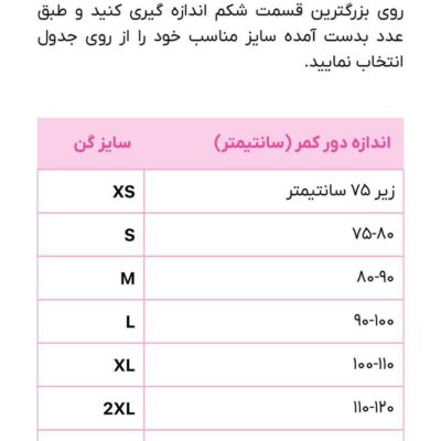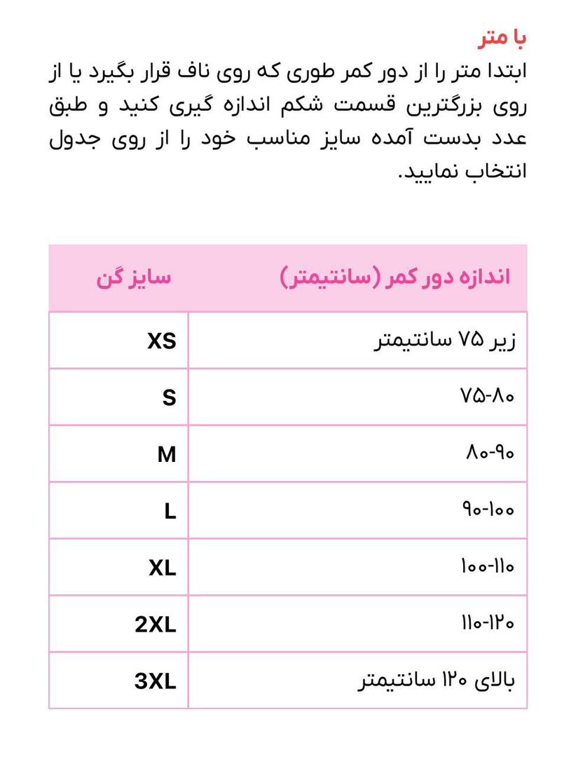 یکی از مهمترین نکات پیش از خرید هر نوع گن، اندازه گیری سایز است. اگر این مرحله به درستی انجام نشود و سایز نامناسبی را برای خرید انتخاب کنید به اهداف مد نظر خود دست پیدا نخواهید کرد. به همین دلیل در این بخش به ارائه نکاتی در این باره خواهیم پرداخت. افرادی که قصد دارند گن غزن دار ایتالیایی مداکینگ را برای خرید انتخاب کنند باید در ابتدا از یک متر خیاطی کمک گرفته و آن را از روی ناف به دورتادور شکم ببندند. حالا میتوانید اندازه به دست آمده را در جدول تعیین شده سایز که توسط شرکت سازنده طراحی میشود قرار دهید. با این کار سایز شما به دست خواهد آمد. شرکت سازنده برای پاسخگویی به نیاز مشتریان این محصول کاربردی را از سایز ایکس لارج تا ۳ ایکس لارج طراحی نموده و به بازار مصرف ارائه داده است تا شما بتوانید بهترین نمونه را انتخاب و خریداری کنید.نکات نگهداری از گن غزن دار مداکینگ